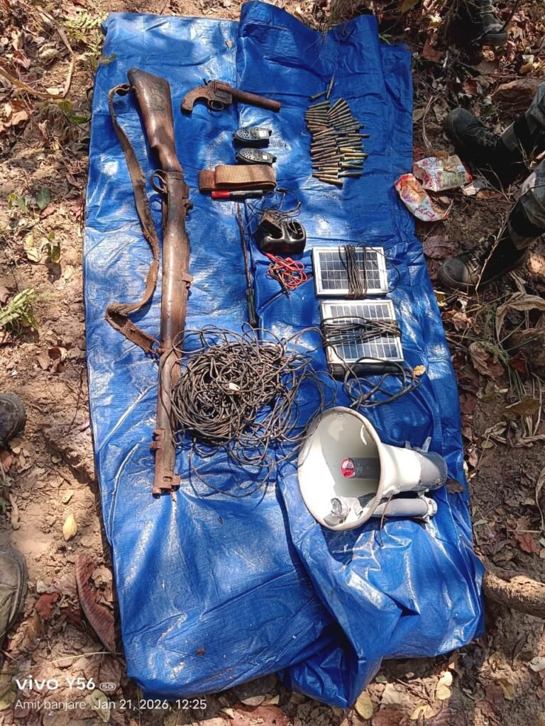 जिसके संबंध में जिला गरियाबंद के आत्मसमर्पित नक्सलियों द्वारा बताये सूचना तंत्रो के माध्यम से आसूचना प्राप्त होने पर कार्यवाही करते हुये जिला मुख्यालय गरियाबंद से जिला पुलिस बल ई-30 ऑपरेशन, सीएएफ एवं सीआरपीएफ की संयुक्त टीम गरियाबंद द्वारा जंगल पहाडी क्षेत्र की ओर सचिंग अभियान के लिए रवाना हुये थे कि अभियान कार्यवाही के दौरान प्राप्त सूचना अनुसार डम्प एरिया में पहुंचकर बीडीएस टीम द्वारा सघन सर्च किया गया सर्च के दौरान दिनांक 23.01.2026 को 01 नग 303 रायफल पुलिस बल से लूटा गया, 01 नग देशी पिस्टल, 12 बोर 31 राण्उड, डेटोनेटर 43 नग, 8 एमएम. कारतूश 48 नग, सौर प्लेट 02 नग, मल्टीमीटर 01 नग, वाकीटाकी 02 नग, इन्र्वटर 01 नग एवं दैनिक उपयोगी सामग्री को विधिवत जप्त कर कार्यवाही की जा रही है। माओवादियों के विनाशकारी नीतियों को विफल करने में पुलिस को सफलता प्राप्त हुई।
