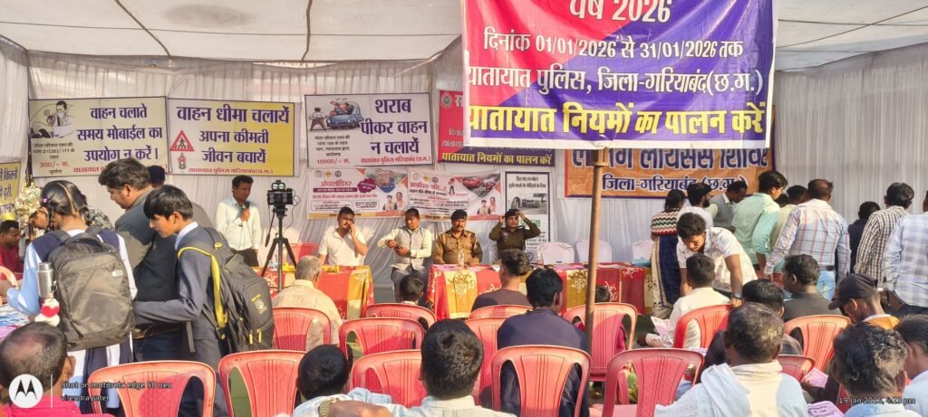 ठाकुर राम,गरियाबंद|गरियाबंद पुलिस द्वारा सड़क सुरक्षा माह अंतर्गत दिनांक 19.01.26 को पुलिस अधीक्षक वेदव्रत सिरमौर के दिशा-निर्देश एवं अतिरिक्त पुलिस अधीक्षक धिरेन्द्र पटेल के मार्गदर्शन में एसडीओपी ओम प्रकाश कुजुर व लितेश सिंह उप पुलिस अधीक्षक नोडल यातायात एवं यातायात टीम जिला परिवाहन अधिकारी रविन्द्र ठाकुर के द्वारा आज दिनांक को थाना मैनपुर क्षेत्र में जिला परिवहन विभाग से समन्वय कर सड़क सुरक्षा कार्यक्रम व लर्निग लायसेंसे शिविर का आयोजन किया गया। इस दो दिवसीय आयोजित शिविर के पहले दिन 45 लोगो का लर्निग लायसेंस बनाया गया।