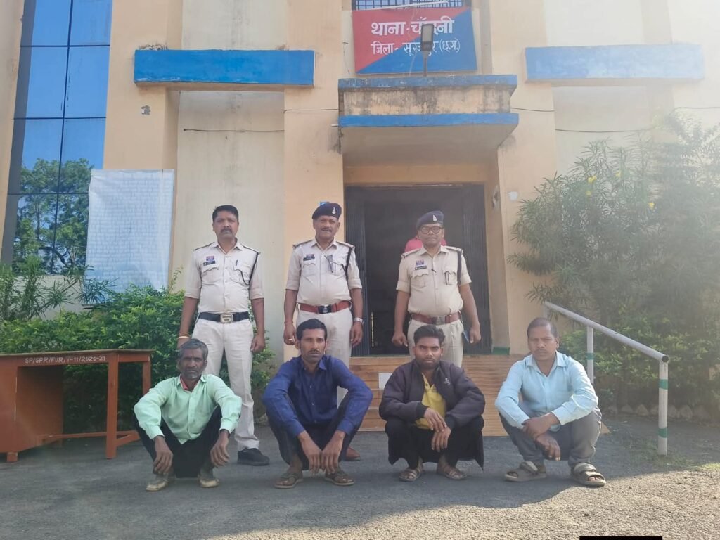 इस मामले में आरोपी अर्जुन देवागंन पिता नधीर देवागंन उम्र 35 वर्ष सा. मसनकी थाना ओडगी, मोहन उर्फ सोनू पिता नोहरसाय उम्र 29 वर्ष ग्राम सावारांवा दर्री घटिया पपडाखांड थाना ओडगी, राजेन्द्र यादव पिता स्व. शीतल प्रसाद उम्र 46 वर्ष ग्राम कर्री चौकी बलंगी थाना रघुनाथनगर जिला बलरामपुर एवं किशोरी लाल यादव पिता नानदाउ यादव उम्र 42 वर्ष सा. कर्री चौकी बलंगी थाना रघुनाथनगर को गिरफ्तार किया गया। इस कार्यवाही में थाना प्रभारी चांदनी आर.पी.साहू, एएसआई क्षेत्रपाल सिंह, प्रधान आरक्षक भूपेन्द्र सिंह पोर्ते, आरक्षक मंजीत कुमार, मंगलसाय, रूप प्रसाद राजवाड़े, मुकेश साहू व आलोक सिंह सक्रिय रहे।