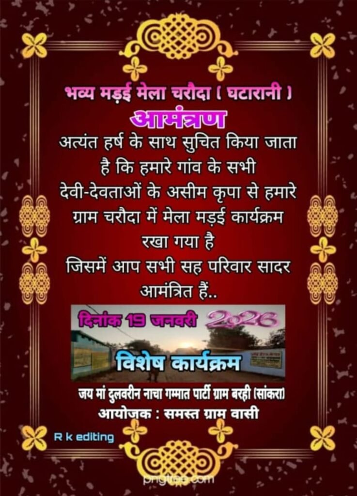 लगातार दो बड़े आयोजनों मड़ई मेला और क्रिकेट महाकुंभ—से ग्राम चरौदा में धार्मिक श्रद्धा, सांस्कृतिक रंग और खेल भावना का अनूठा संगम देखने को मिलेगा। आयोजकों एवं समस्त ग्रामवासियों ने क्षेत्र की जनता से अपील की है कि वे अधिक से अधिक संख्या में पहुंचकर इन आयोजनों को ऐतिहासिक और सफल बनाएं।