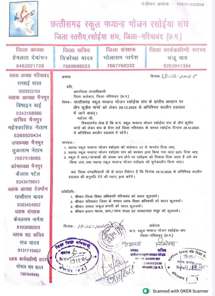 रायपुर| छत्तीसगढ़ स्कूल मध्यान्ह भोजन रसोइया संघ के प्रांतीय आव्हान पर तीन सूत्रीय मांगों को लेकर संघ के बैनर तले छत्तीसगढ़ के सभी जिलों के समस्त रसोईया 29/12/25 से अनिश्चित कालीन हड़ताल करेंगे।