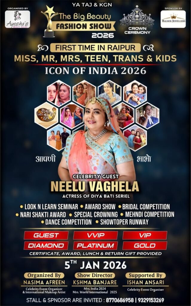 रायपुर। छत्तीसगढ़ की राजधानी रायपुर एक बार फिर फैशन, ग्लैमर और प्रतिभा का बड़ा मंच बनने जा रही है। The Big Beauty Fashion Show 2026 के अंतर्गत “Icon of India 2026” का भव्य आयोजन 5 जनवरी 2026 को रायपुर में किया जाएगा। यह आयोजन शहर में पहली बार इतने बड़े स्तर पर Miss, Mr, Mrs, Teen, Trans & Kids कैटेगरी के लिए आयोजित किया जा रहा है।