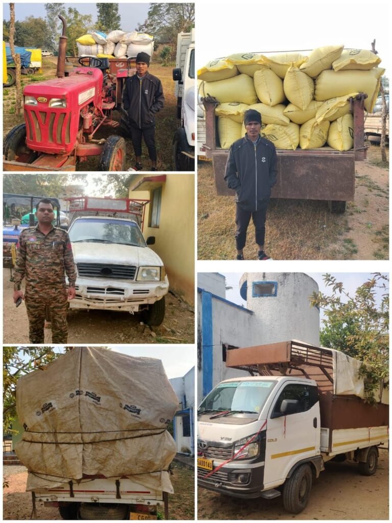 गरियाबंद|गरियाबंद पुलिस के वरिष्ठ अधिकारियों द्वारा दीगर राज्य से आने वाले धान के परिवहन की रोकथाम हेतु बार्डर के चेक पोस्ट में तैनात बल द्वारा गैरकानूनी गतिविधियों पर प्रभावी नियंत्रण हेतु विशेष दिशा-निर्देश जारी किया गया था। छत्तीसगढ़ शासन द्वारा समर्थन मूल्यों पर धान खरीदी केवल पंजीकृत किसानों को निर्धारित धान खरीदी केंद्रों में किये जाने हेतु प्रावधान है। चेक पोस्ट के माध्यम से तैनात पुलिस द्वारा अवैध गतिविधियों पर सतत निगरानी रखी जा रही है। दिनांक 04-05.01.2026 को मुखबीर से थाना देवभोग को सूचना मिला की 06 वाहनों में उडीसा की ओर से थाना देवभोग क्षेत्र में अवैध धान भर बिक्री करने के लिए परिवहन कर रहा है। सूचना तस्दीक पर पुलिस टीम अलग-अलग घटना स्थल रवाना हो कर घटना स्थल से अवैध धान भरा हुआ बोलेरा पीकअप वाहन क्रमांक ओ.डी 08-एस-9498 में 60 कट्टा (24 कि्ंवटल), बोलेरो पीकअप वाहन क्रमांक सीजी-19-बीजे-8085 में 60 कट्टा धान (24 कि्ंवटल), बोलेरो पीकअप वाहन क्रमांक सीजी 14 एमपी-3954 में 60 कट्टा धान (24 कि्ंवटल), बोलेरो पीकअप वाहन क्रमांक सीजी-07 बीजे-6803 में 60 कट्टा धान (24 कि्ंवटल), दो बिना नम्बर प्लेट वाली ट्रेक्टर में 140 कट्टा (56 कि्ंवटल) कुल 380 अवैध धान जप्त। इसी क्रम मे थाना अमलीपदर को मुखबीर से सूचना मिला की उडिसा की ओर से एक बोलेरो पीकअप में अवैध रूप से धान परिवहन कर बिक्री करने के लिए जा रहा है। जिसकी सूचना दतस्दीक हेतु घटना स्थल पर पुलिस टीम रवाना कर ट्रेक्टर क्रमांक सीजी 04 वीएम-1656 में 80 कट्टा धान प्रत्येक में 45 की भरती कुल (36 कि्ंवटल) बिक्री हेतु परिवहन करते पाया गया। इसी प्रकार थाना प्रभारी पीपरछेड़ी को मुखबीर से सूचना मिला की एक इंट्रा पीकअप वाहन में उडिसा से अवैध धान बिक्री हेतु ग्राम तेन्दुवाय के रास्ते परिवहन कर रहा है। मुखबीर द्वारा बनाये गये घटना स्थल पर पहुच कर अवैध धान से भरा हुआ इंट्रा पीकअप वाहन क्रमांक सीजी-05-एयू-0140 में 95 कट्टा (38 कि्ंवटल) धान अवैध रूप से परिवहन करते पाया गया। इस प्रकार कुल 08 प्रकरणों में कुल 555 कट्टा (226 कि्ंवटल) धान के साथ 08 चार पहिया वाहन को समक्ष गवाहन के जप्त कर संबंधित विभाग को सुपुर्द किया गया।