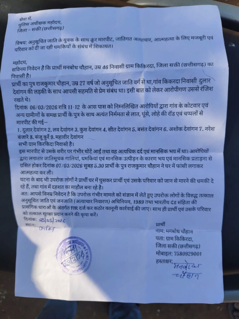 शिकायत के अनुसार,बिर्रा थाना क्षेत्र के ग्राम किकिरदा निवासी मनबोध चौहान के 27 वर्षीय पुत्र राजकुमार चौहान का गांव की एक युवती के साथ आपसी सहमति से प्रेम संबंध था। इसी बात को लेकर कुछ लोगों द्वारा उससे रंजिश रखी जा रही थी। परिजनों का आरोप है कि 6 मार्च 2026 की रात करीब 11- 12 बजे के बीच गांव के कुछ लोगों ने राजकुमार को सार्वजनिक रूप से लात-घूंसों, लोहे की रॉड और चप्पलों से बेरहमी से पीटा, इस दौरान उसे जातिसूचक गालियां दी गईं और लगातार धमकाया गया।