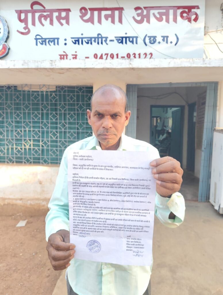 इसके बाद न्याय की उम्मीद में पीड़ित परिवार जांजगीर पुलिस अधीक्षक कार्यालय पहुंचा, जहां से उन्हें अजाक थाना भेज दिया गया। पीड़ित परिवार ने पुलिस प्रशासन से मांग की है कि आरोपियों के खिलाफ अनुसूचित जाति एवं जनजाति (अत्याचार निवारण) अधिनियम, 1989 तथा भारतीय दंड संहिता की संबंधित धाराओं के तहत तत्काल मामला दर्ज कर कड़ी कानूनी कार्रवाई की जाए। साथ ही परिवार को सुरक्षा प्रदान की जाए। अब देखना होगा कि अपने बेटे को खो चुके इस पीड़ित परिवार को न्याय मिल पाता है या फिर उन्हें यूं ही थानों के चक्कर लगाने के लिए मजबूर होना पड़ेगा।