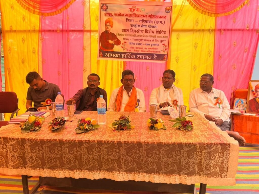 गरियाबंद| शासकीय नवीन महाविद्यालय गोहरापदर, जिला गरियाबंद के राष्ट्रीय सेवा योजना (रा.से.यो.) इकाई द्वारा “नशामुक्त समाज के लिए युवा” विषय पर सात दिवसीय विशेष शिविर का आयोजन 29 जनवरी 2026 से 04 फरवरी 2026 तक ग्राम डुमाघाट, पोस्ट–काण्डसर, तहसील अमलीपदर, जिला गरियाबंद (छत्तीसगढ़) में किया जा रहा है।