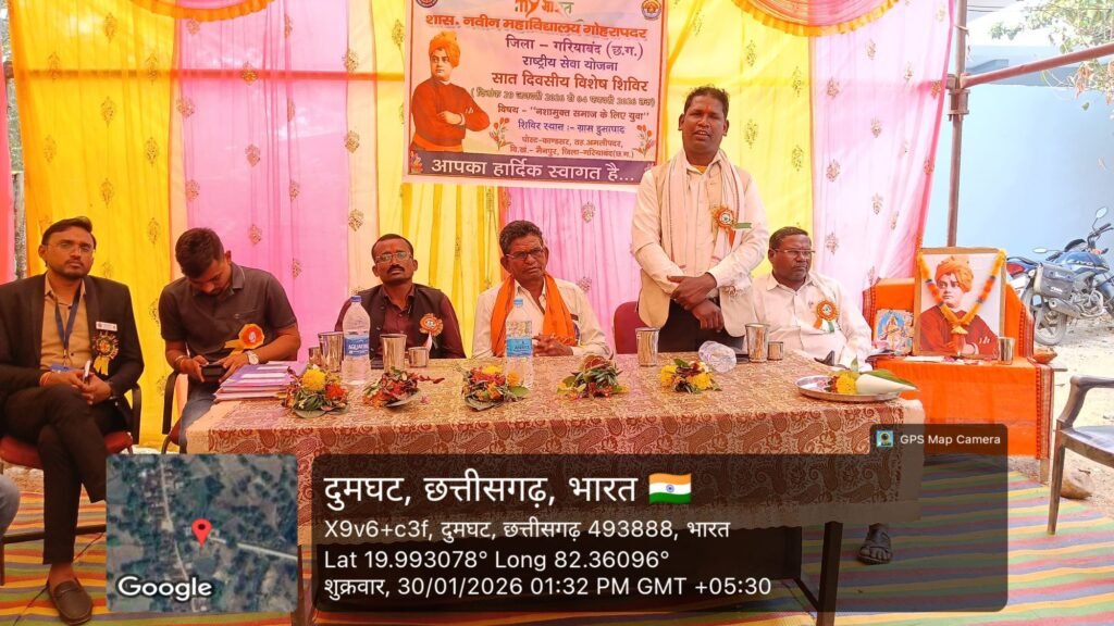 गरियाबंद|गरियाबंद – छत्तीसगढ़ शासन के दिशा-निर्देशानुसार राष्ट्रीय सेवा योजना (एनएसएस) के तत्वावधान में ग्राम डूमाघाट, पोस्ट काण्डसर, तहसील अमलीपदर, जिला गरियाबंद (छत्तीसगढ़) में “नशामुक्त समाज के लिए युवा” विषय पर आयोजित सात दिवसीय विशेष शिविर 29 जनवरी से 4 फरवरी 2026 तक अत्यंत सफलतापूर्वक संपन्न हुआ। यह शिविर महाविद्यालय के कार्यक्रम अधिकारी श्री सनत कुमार के कुशल नेतृत्व, अनुशासित संचालन एवं समर्पित मार्गदर्शन में आयोजित किया गया।
