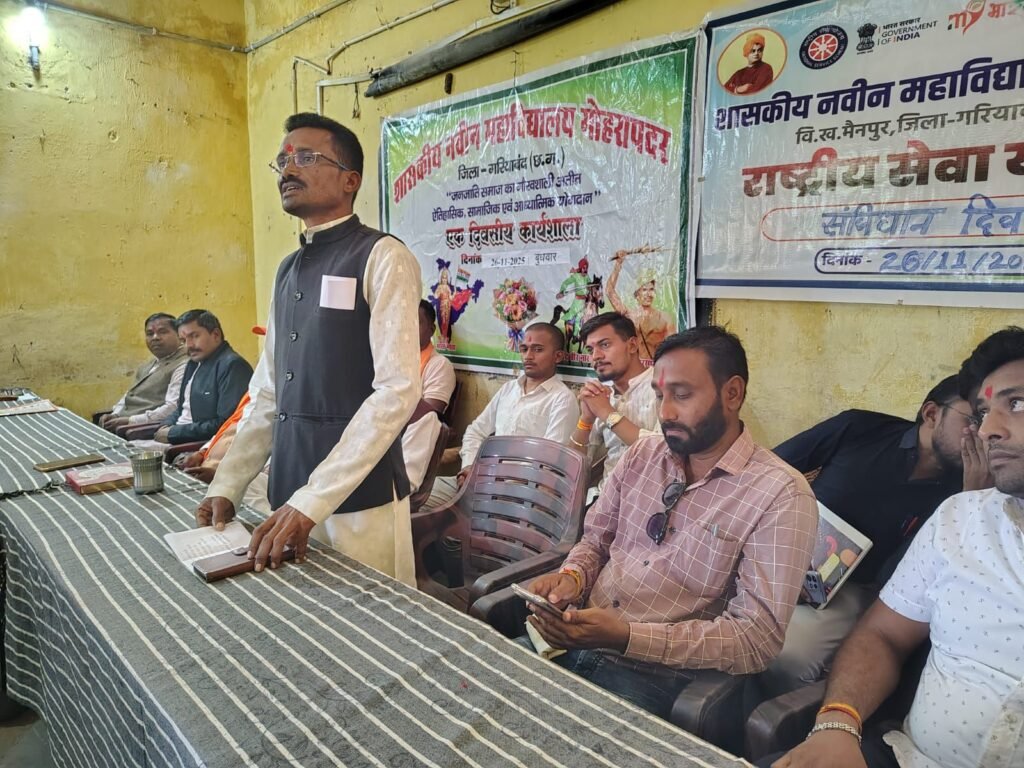 गरियाबंद।शासकीय नवीन महाविद्यालय गोहरापदर, जिला गरियाबंद (छत्तीसगढ़) में आज महाविद्यालय एवं राष्ट्रीय सेवा योजना (NSS) इकाई के संयुक्त तत्वावधान में “संविधान दिवस एवं जनजातीय समाज का गौरवशाली अतीत” विषय पर एक दिवसीय विशेष कार्यक्रम का सफल आयोजन प्राचार्य डॉ. टी. एस. सोनवानी के मार्गदर्शन में संपन्न हुआ।