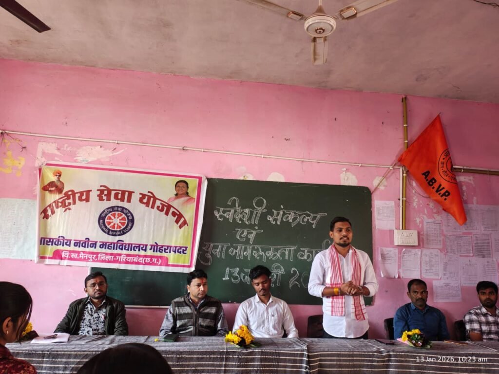गरियाबंद|शासकीय नवीन महाविद्यालय, गोहरापदर, जिला गरियाबंद (छत्तीसगढ़) में दिनांक 13 जनवरी 2026 को राष्ट्रीय सेवा योजना के तत्वावधान में तथा अखिल भारतीय विद्यार्थी परिषद (अभाविप) के सहयोग से स्वदेशी संकल्प एवं युवा जागरूकता कार्यक्रम का आयोजन किया गया। कार्यक्रम का आयोजन महाविद्यालय के प्राचार्य डॉ. टी. एस. सोनवानी के निर्देशन एवं रासेयो कार्यक्रम अधिकारी श्री सनत कुमार के मार्गदर्शन में किया गया।