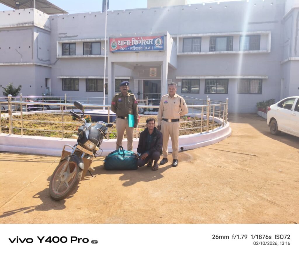 गरियाबंद|गरियाबंद पुलिस का नशे के विरूद्ध *‘‘नया सवेरा’’* अभियान अंतर्गत वरिष्ठ अधिकारियों के द्वारा समस्त थाना प्रभारियों को अपने-अपने थाना क्षेत्रातंर्गत अवैध शराब, गांजा एवं नशीली पदार्थों के परिवहन एवं बिक्री करने वालों पर कड़े कार्यवाही एवं प्रतिबंध लगवाने के संबंध में निर्देश दिये गये थे। जिसके परिपालन में समस्त थाना प्रभारी अपने अपने थाना क्षेत्रों में मुखबीर एवं पेट्रोलिंग को सक्रिय किये है। जो दिनांक 09.02.2026 को थाना प्रभारी फिंगेश्वर मुखबीर से सूचना मिला की एक व्यक्ति अपने बिना नम्बर प्लेट वाली स्प्लेण्डर मोटर सायकल मे अवैध रूप से शराब बिक्री हेतु परिवहन कर रहा है। सूचना तस्दीक पर हमराह स्टाफ एवं गवाहन के घटना स्थल पहुंचकर मुखबीर के बताये स्थान पर रेड़ कार्यवाही करने पर आरोपी लोमेश ध्रुव पिता रामजी ध्रुव उम्र 30 वर्ष साकिन फिंगेश्वर, थाना फिंगेश्वर, जिला गरियाबंद (छ.ग.) के पास से एक हरा रंग के बेग में 150 नग पौवा देशी मदिरा मशाला शराब प्रत्येक में 180-180 एमएल शराब भरा हुआ कुल 27 लीटर कीमती 15000/- रूपये एवं एक मोटर सायकल बिना नम्बर प्लेट स्प्लेण्डर कीमती 30 हजार रूपये मिलने पर आरोपी के कब्जे से समक्ष गवाहन के जप्त कर पुलिस कब्जा में लिया गया। आरोपी का उक्त् कृत्य अपराध धारा 34(2) आबकारी एक्ट का पाये जाने से थाना फिंगेश्वर में अपराध क्रमांक 33/2026 धारा 34(2) आबकारी एक्ट कायम कर विवेचना में लिया गया। प्रकरण में आरोपी लोमेश ध्रुव के विरूद्ध पर्याप्त साक्ष्य पाये जाने से विधिवत गिरफ्तार कर माननीय न्यायालय के समक्ष पेश किया गया।
