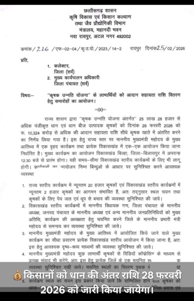 कृषि विकास एवं किसान कल्याण विभाग द्वारा जारी निर्देशों के अनुसार, “कृषक उन्नति योजना” अंतर्गत पंजीकृत धान एवं धान बीज उत्पादक किसानों को यह सहायता राशि सीधे उनके बैंक खातों में अंतरित की जाएगी। राज्य स्तर पर आयोजित मुख्य कार्यक्रम में बड़ी संख्या में किसानों की उपस्थिति रहेगी, वहीं सभी विकासखंडों में भी समानांतर कार्यक्रम आयोजित किए जाएंगे।